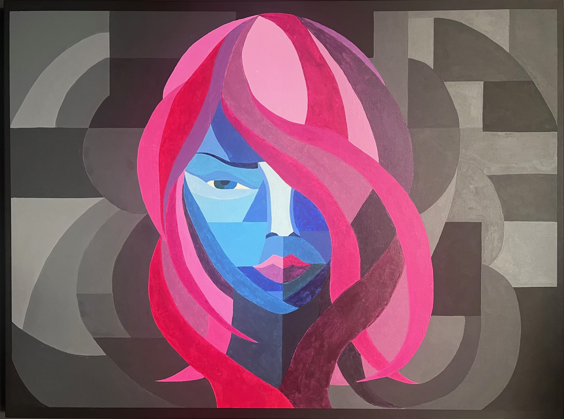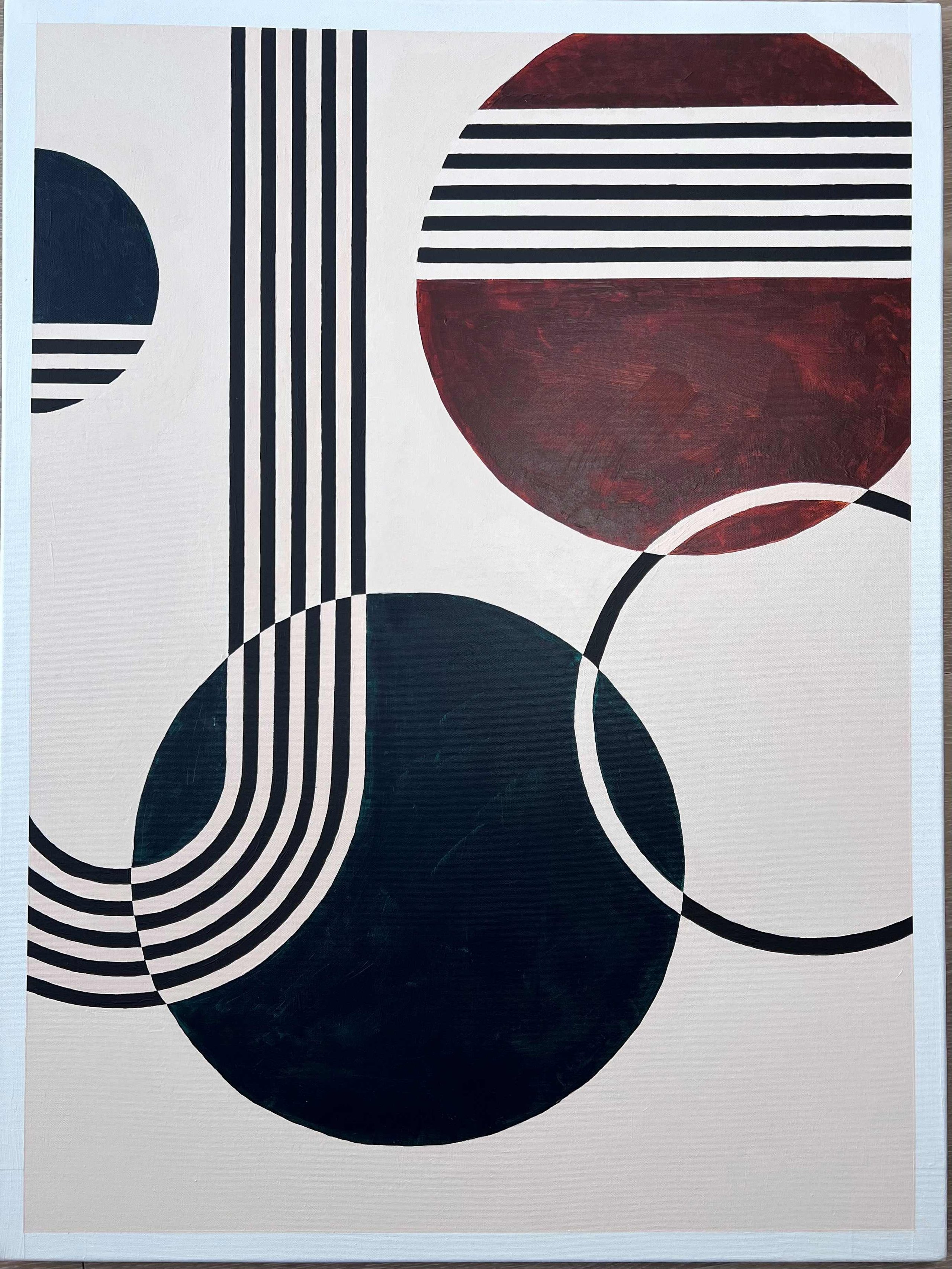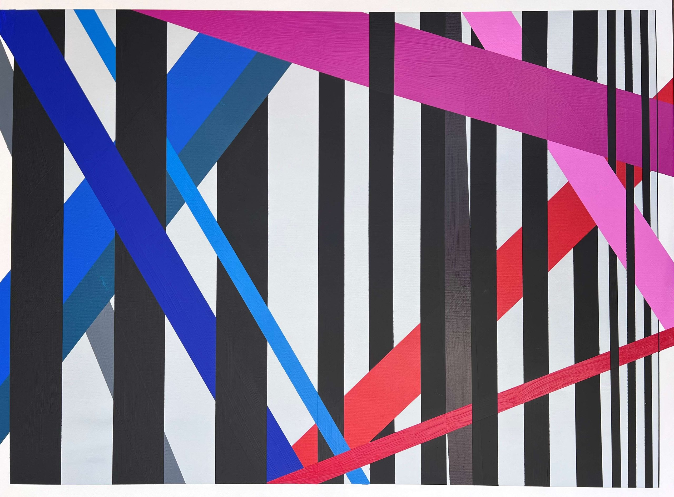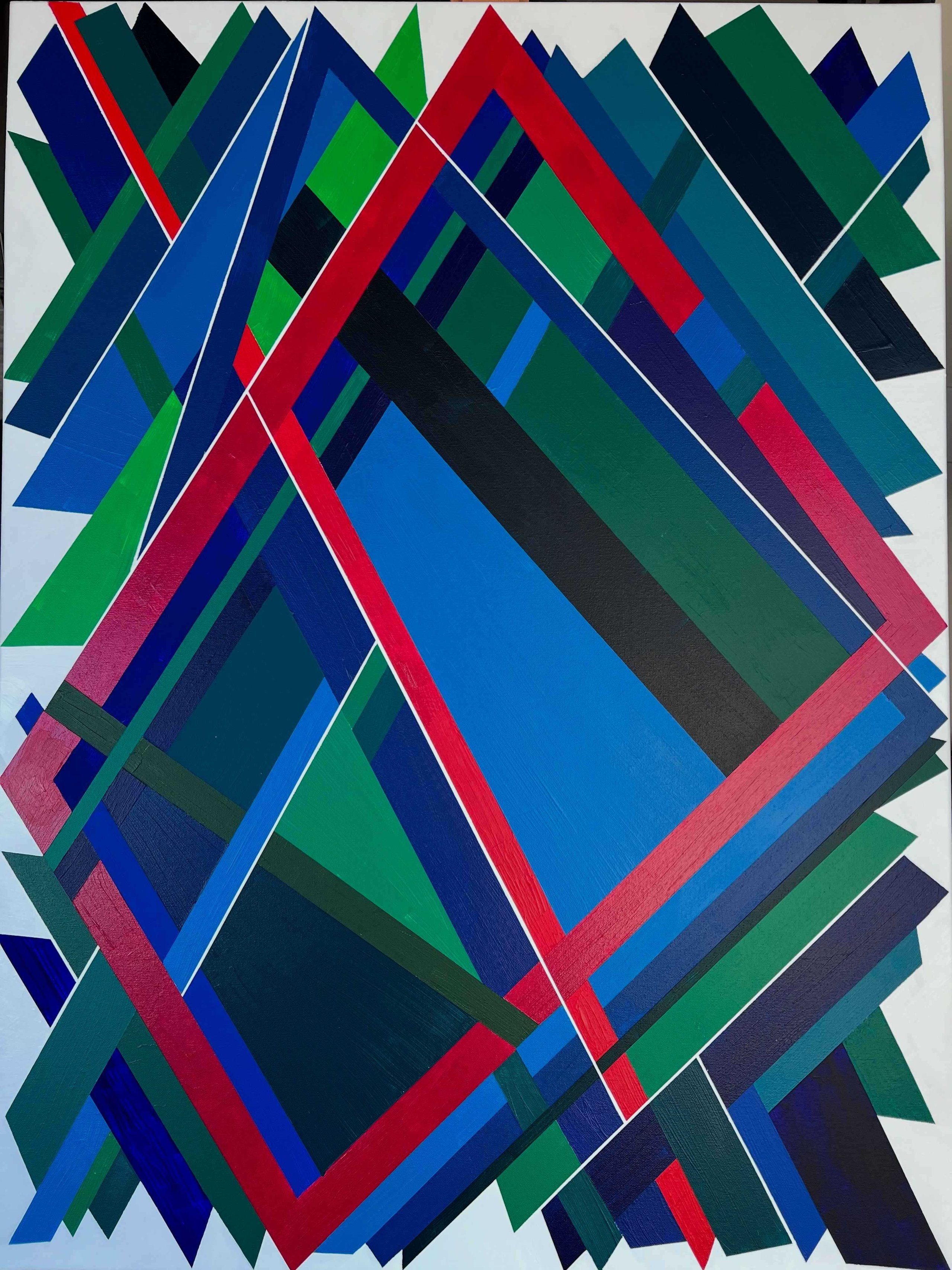 A collection of modern paintings defined by structured lines and saturated colors. Each piece balances control or spontaneity through layered form and movement.
