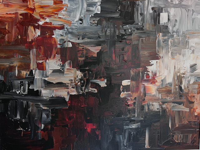 shades of orange, brown, black, white acrylic paint on 30in x 40in stretched canvas